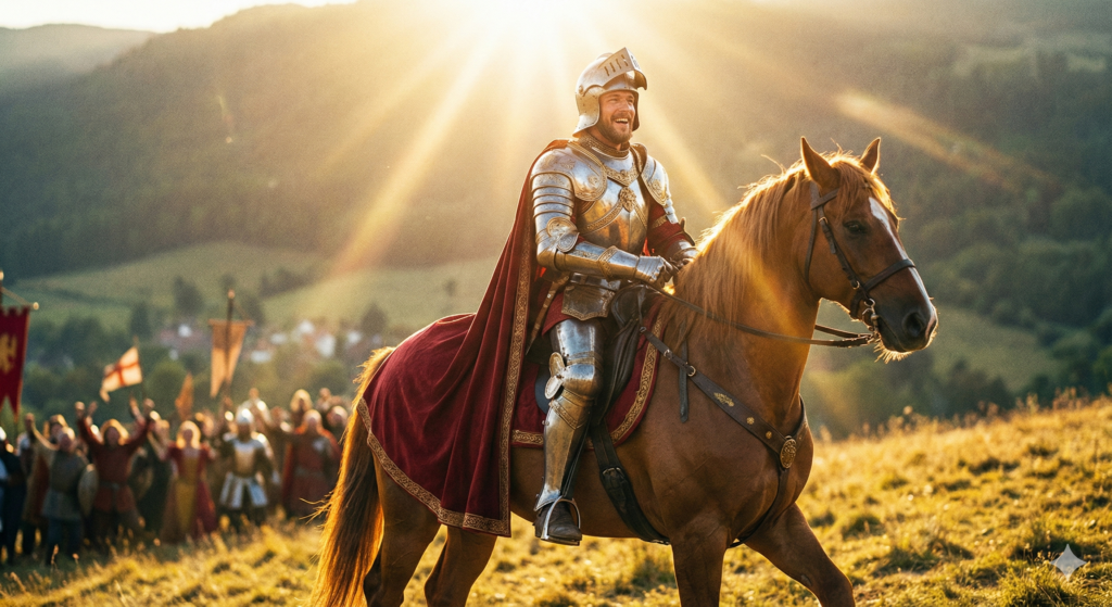 Siehst du den strahlenden Reiter? Die Sonne scheint ihm ins Gesicht, er sitzt aufrecht, vielleicht glänzt seine Rüstung. Er reitet nicht einfach nur, er präsentiert sich.